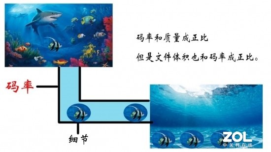 那么为什么笔者会这么肯定呢?答案在于 “码率”,视频码率就是数据传输时单位时间传送的数据位数,相当于我们从海洋向一个泳池输送海水,而这个输送通道就是“码率”,通道越粗,水流越快,包括海洋中的生物也会进入泳池,这样的泳池就会更接近海洋;通道越窄,则情况相反,没有了海洋生物,自然丢失了海洋的细节。