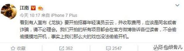 近日,有网友爆料称,《龙族》即将被搬上荧屏,甚至还有剧组在招募演员并收取费用。一时间,引来众多粉丝关注。然而就在12月11日,江南在微博上发文辟谣,表示网上传出的消息纯属同名或诈骗,同时呼吁网友千万不要理会。