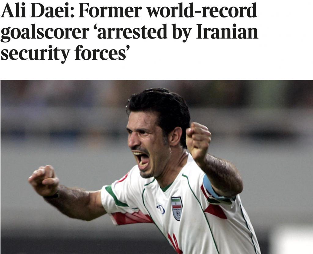 9 月 27 日,伊朗著名足球运动员,被誉为 " 亚洲第一前锋 " 的阿里代伊,表达了对抗议活动的支持,希望政府能解决民众诉求,而不是一味镇压,旋即被逮捕。