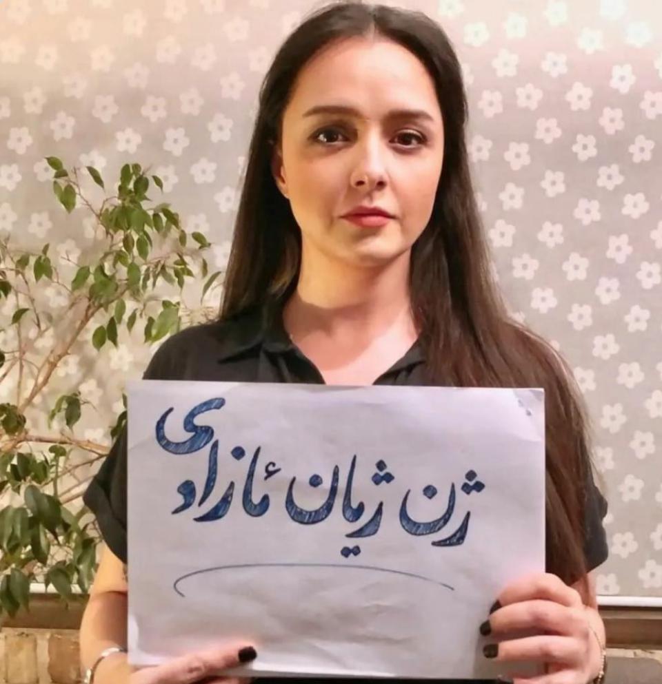 11 月 10 日,伊朗著名演员塔拉内 · 阿里多斯蒂(《推销员》)在 ins 上晒出不带头巾的自拍,举着此次抗议运动的口号牌: