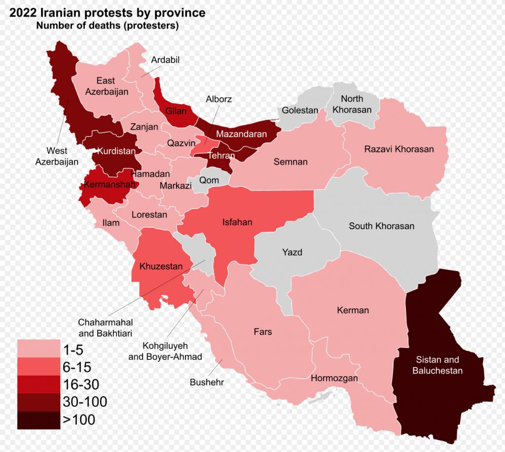 示威死亡人数统计,按省份划分(数据来自伊朗人权组织)