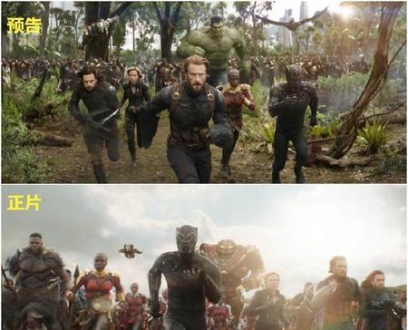 比如《复仇者联盟3》的预告片中就有不少假镜头,最为知名的就是下图中的冲锋镜头了,预告片中是有浩克的,谁能想到正片中浩克直接不出来了?