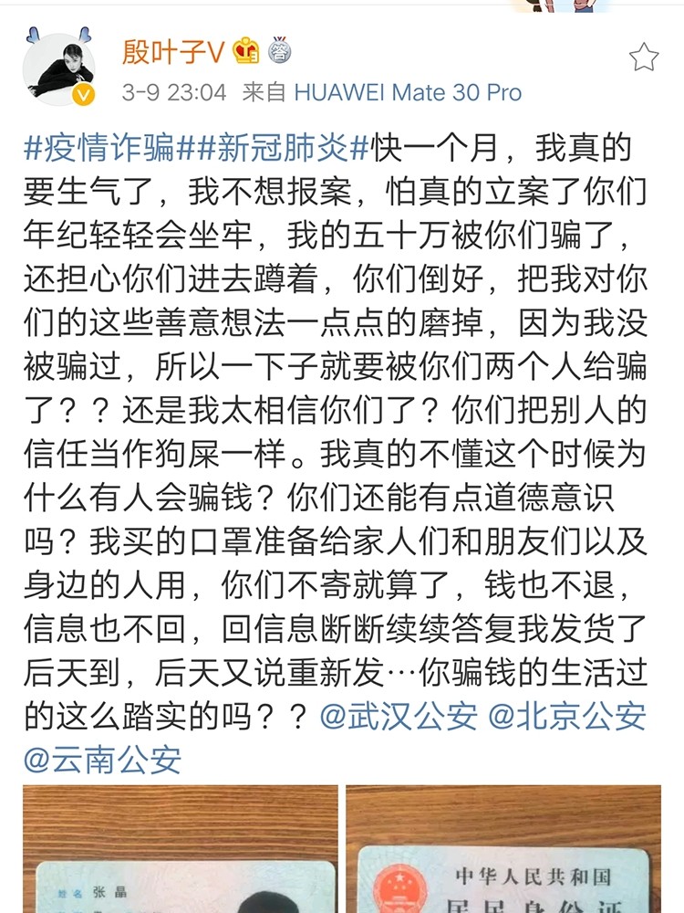 所以一下子就要被你们两个人给骗了,还是我太相信你们了,你们要把别人的信任当成从狗屎一样......你们不寄也就算了,钱也不退,信息也不回,回信息断断续续答复我发货了后天到,后天又说重新发......你们骗钱的,生活过得这么踏实的吗?然后殷叶子艾特了武汉公安,北京公安,云南公安,最后殷叶子还晒出了犯罪嫌疑人身份证照片。