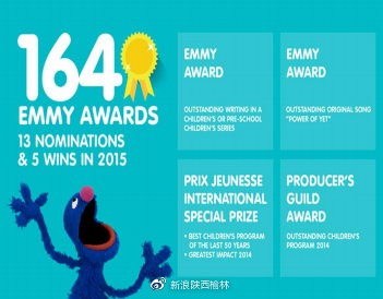 2009年,《芝麻街》赢得了第153个艾美奖,以获得艾美奖最多的电视节目载入吉尼斯世界纪录。截止目前,《芝麻街》已荣获164座艾美奖以及9项格莱美大奖,并获得了艾美奖的终身成就奖。仅在2015年,《芝麻街》就获得了13项艾美奖提名,并荣获了其中的5个奖项。