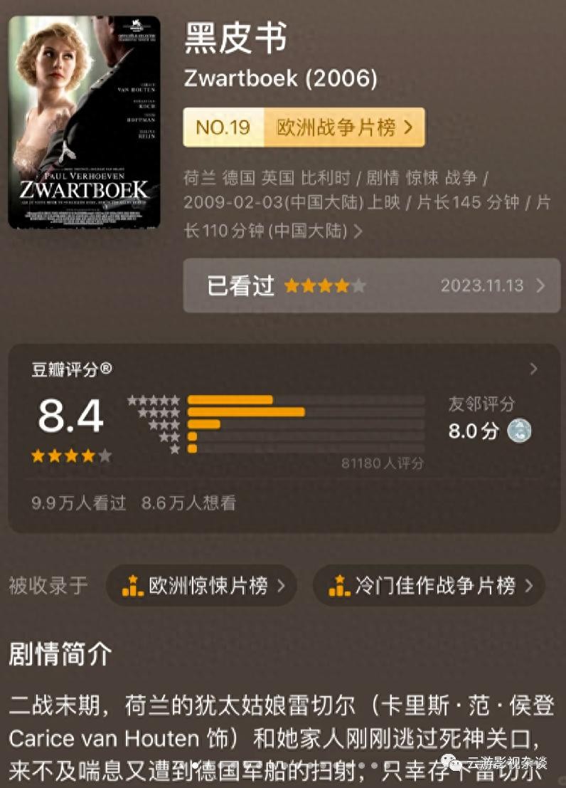 《黑皮书》可以说是荷兰最好的一部电影!由真实故事改编,既有香艳细腻的情感,又有跌宕起伏的叙事,有洞见人性的深度,更有真实历史的厚重,精彩绝伦,剧情满分!