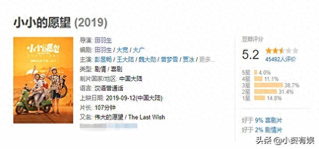 《小小的愿望》并不难看,甚至比同期电影要优秀,肖战、孟美岐的魔幻电影《诛仙》4.02亿,赚足人热泪的《小Q》仅1.1亿,《小小的愿望》不仅制作成本低,而且没有一线明星加盟,能有2.67亿票房,实在难得。