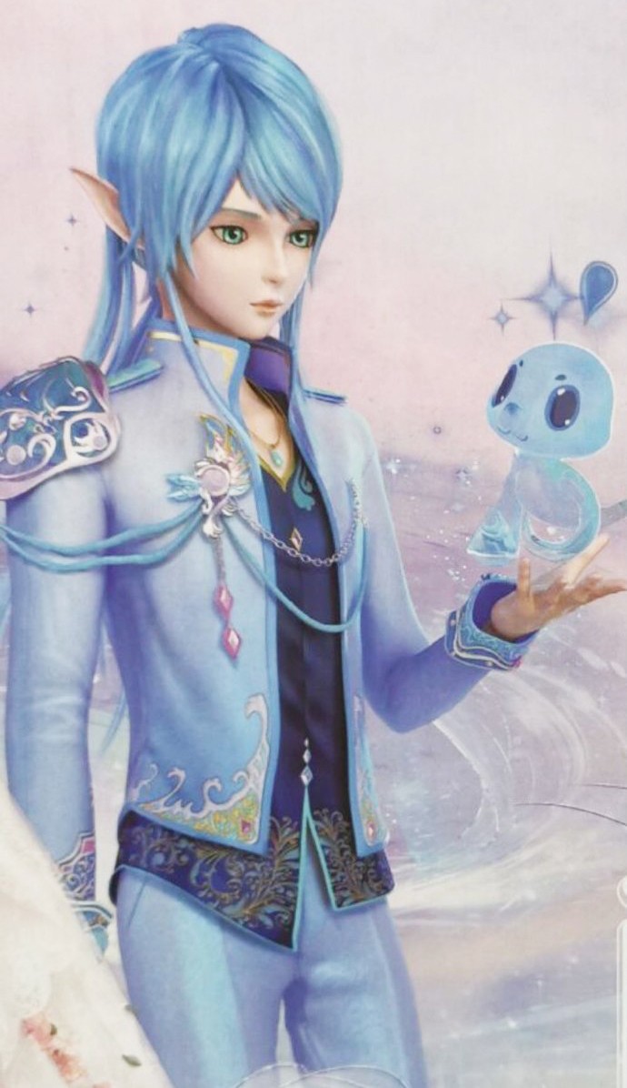 在官方出品的周边封面中,又再出现了这只水精灵,看来这个水精灵就是水王子的圣兽,当然这只是它没有变身时候的造型。从它的造型设计来看,黑色的大眼睛,透明蓝的身体,和水王子一样都是水中的精灵。当然它变身之后的形象,不用猜了,肯定是初期设定的“水龙”形象。