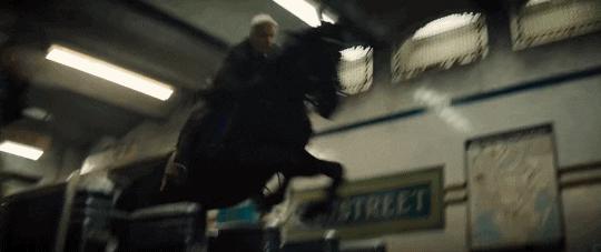 在被纳粹追杀的路上,琼斯的逃亡方式是骑马,而对方开摩托车紧追,将他逼近地铁。在这个密闭的现代空间里,琼斯惊慌逃窜。