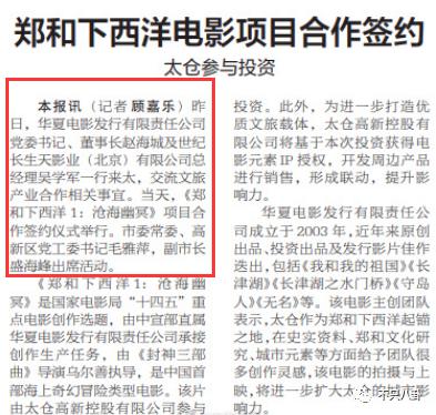 就在 11 月 16 日,华夏电影发行有限责任公司及世纪长生天影业(北京)有限公司负责人去太仓,在当地举行了《郑和下西洋 1:沧海幽冥》项目合作签约仪式举行。