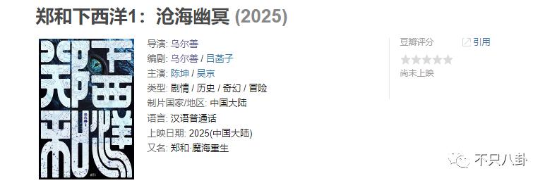 此外,乌尔善导演还有一个重要任务,那就是拍摄《郑和下西洋:沧海幽冥》。豆瓣显示,该片预计在 2025 年上映,这就意味着现在就要着手准备拍摄,否则时间就来不及了。