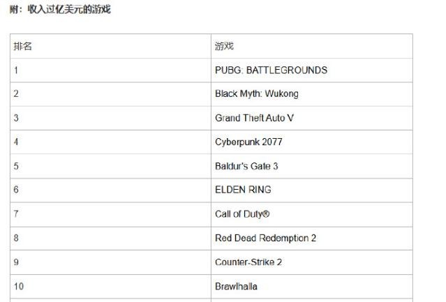 但是,虽然《绝地求生》仍以超10亿美元收入位居榜首,由于其早在2022年1月份就转为免费游戏了,因此《黑神话:悟空》毫无悬念地成为了Steam平台上收入最高的付费游戏。可以说这回真的是出道即巅峰,出手即登顶了。