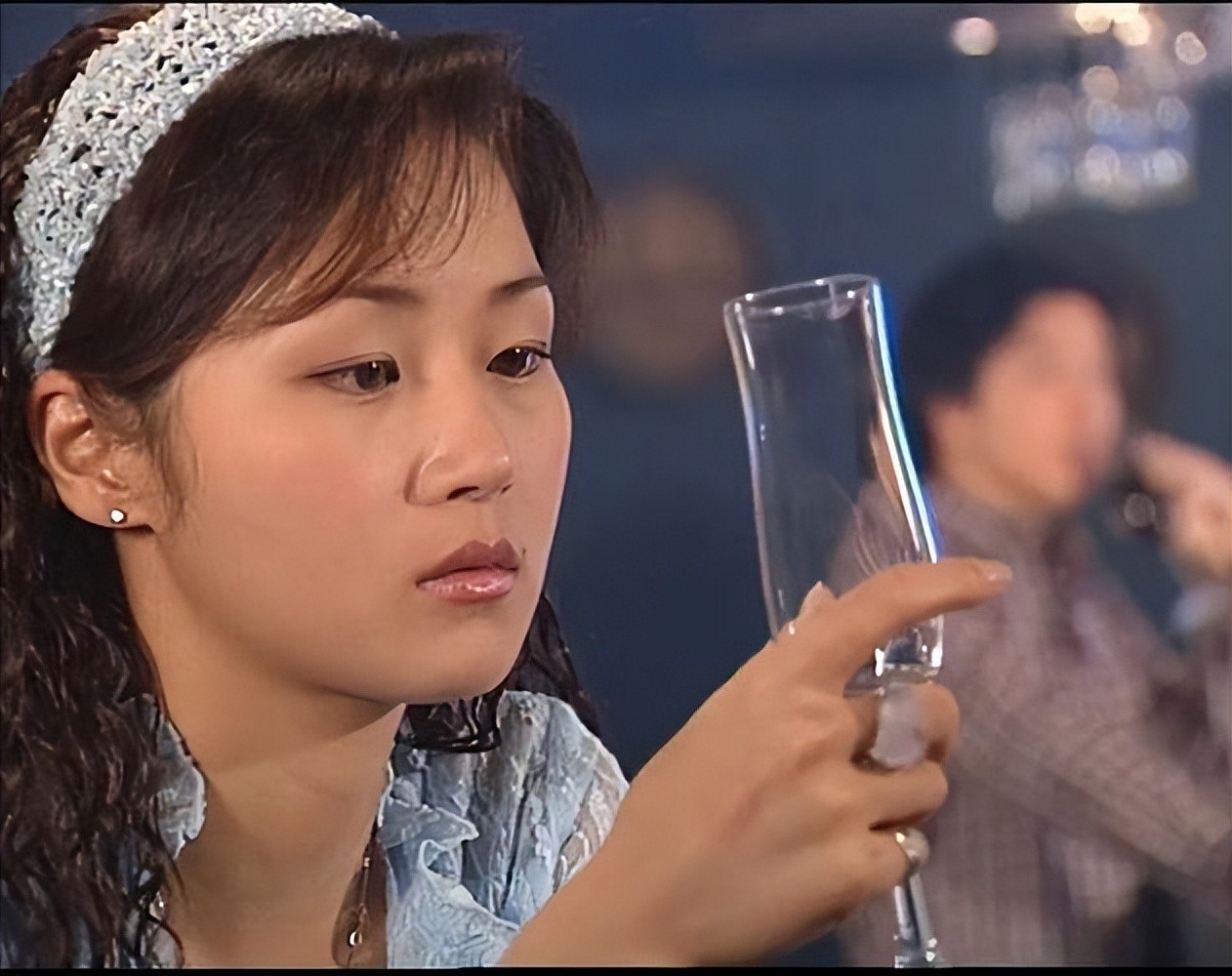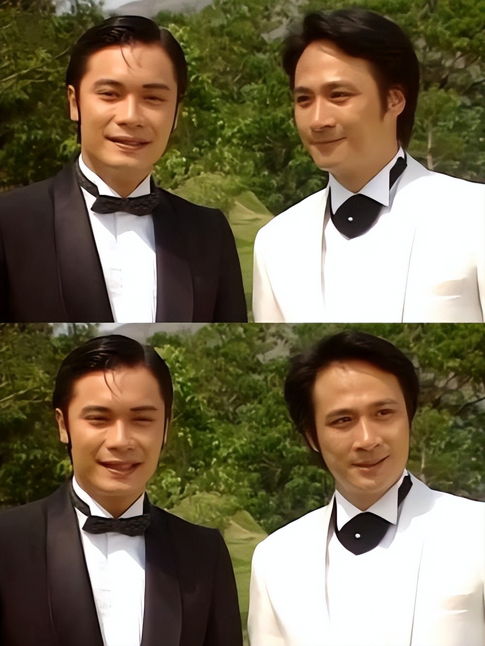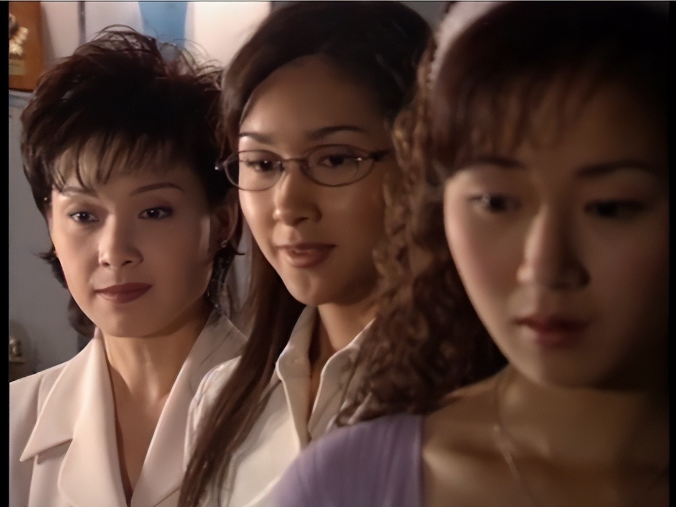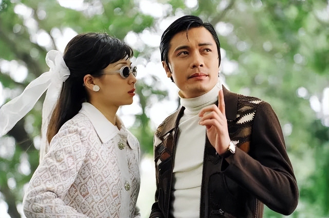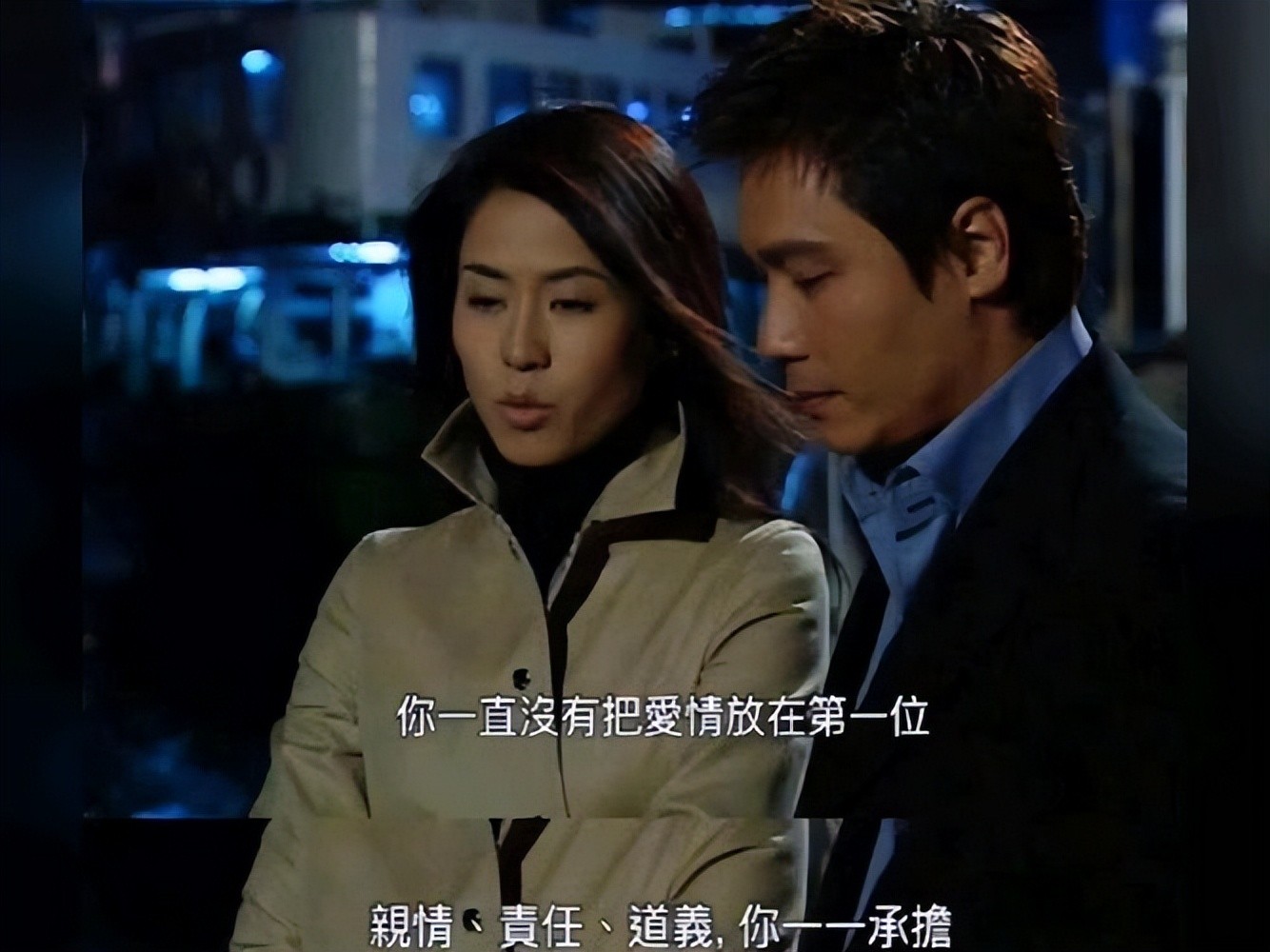 还有个镜头记忆犹新:左边是周海媚抿嘴一笑的侧颜特写,右边是黄日华的半身虚化镜头。
