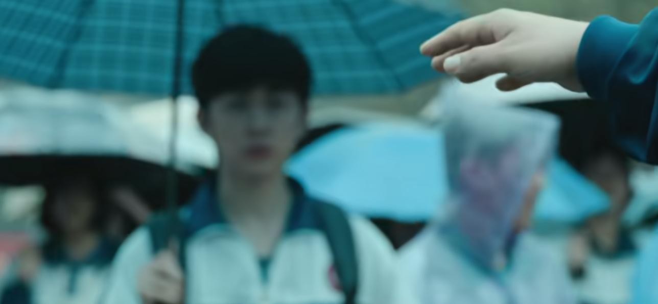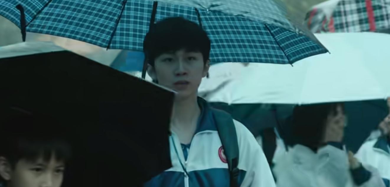 这里得夸一下剧组妆造人员,这个妆效化得太自然了,而且两个霸凌者还穿着五彩斑斓的服装,一看就不是好孩子,和张文轩身上的校服对比明显。