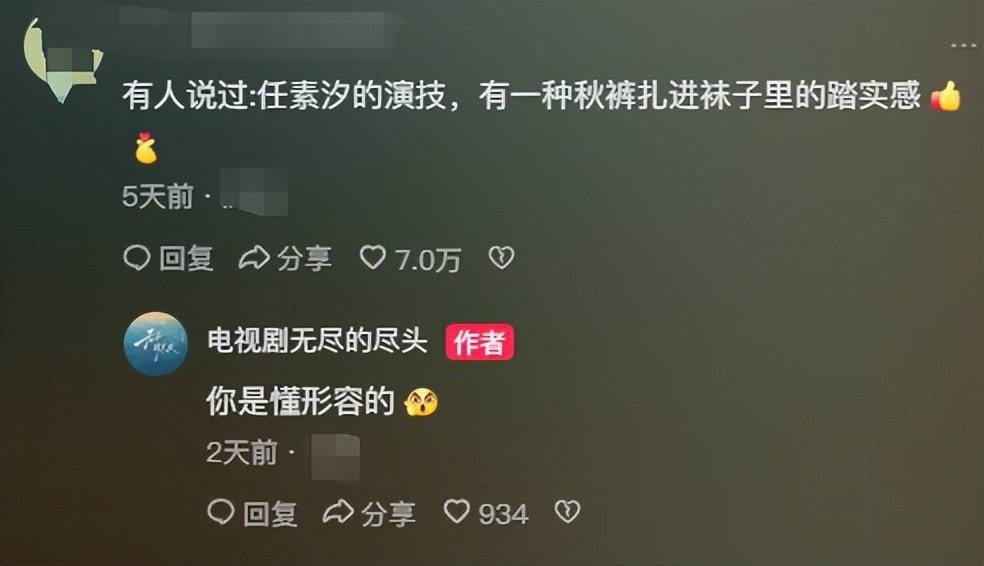 有位网友非常会形容,说任素汐的演技就像“秋裤塞进袜子里一样踏实。”