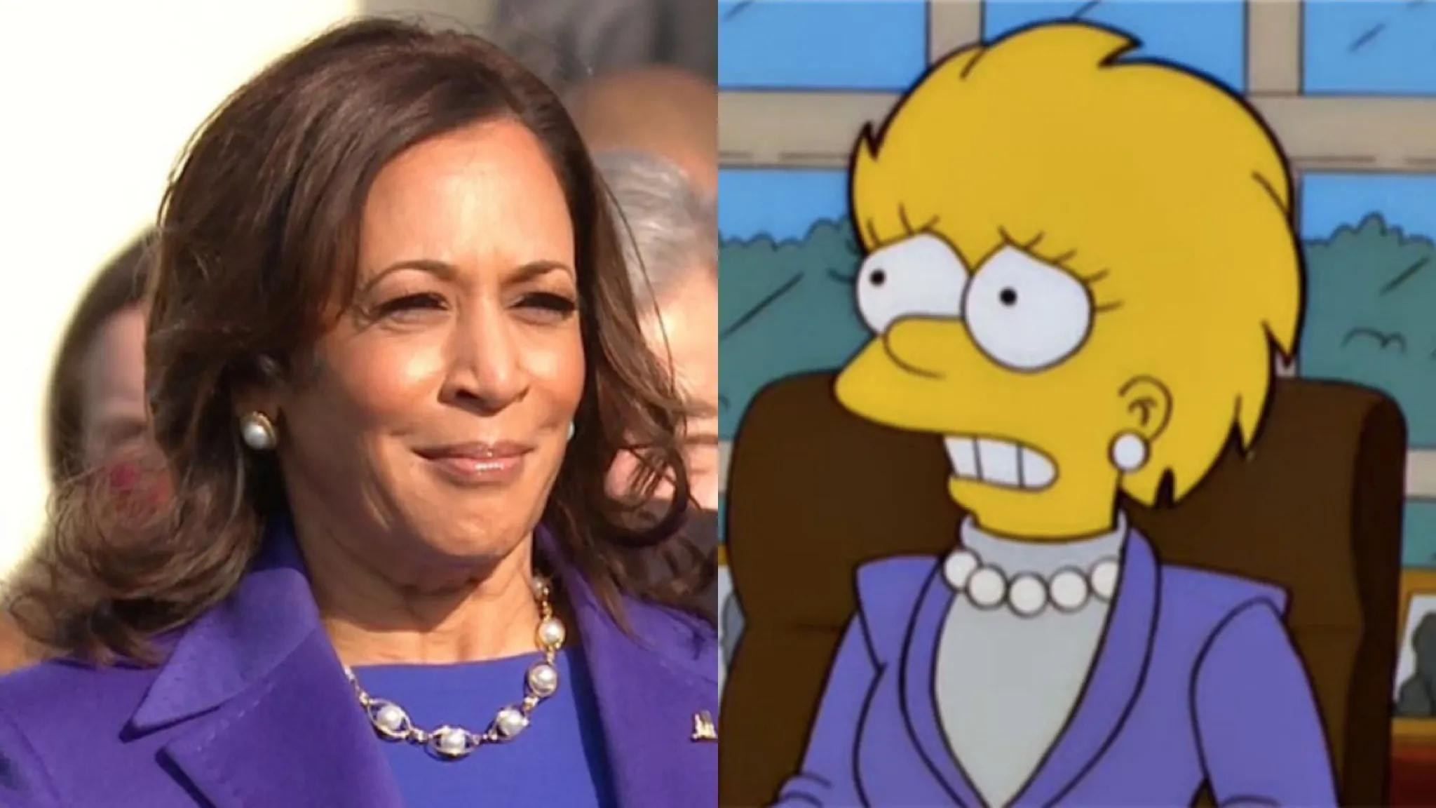 2021年1月20日 美国副总统卡马拉·哈里斯宣布就职当天,身穿紫色西装外套、搭配的珍珠项链和耳环,恰好与2000年播出的《辛普森一家》第十一季第十七集《巴特到未来》剧情中,丽萨·辛普森就任美国总统时的穿着一模一样。