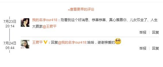 这一段文字被网友认为是顺利生下了二胎,而且是儿子,但都只是猜测,并没有得到王君平的回应。近日,王君平终于回复网友的祝福,默认了儿女双全的幸福。