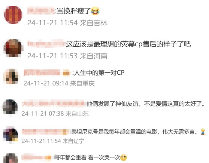 网友评论,“这应该是最理想的荧幕cp售后的样子了吧”“他俩发展了神仙友谊”,还有人表示每年都会重看《泰坦尼克号》,“看一次哭一次”“伟大无需多言”。