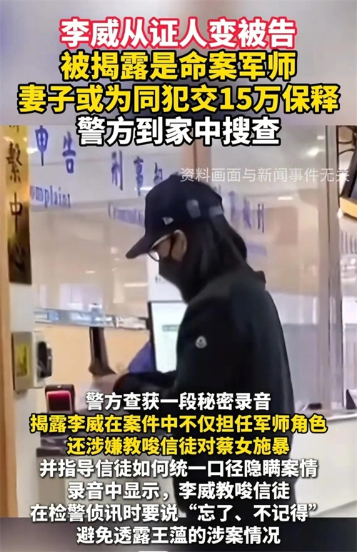 事发后台当地检察机关经过调查发现,当时在场除了死者外,还有13人,其中就包括李威夫妇和王蕰。李薇也因此被警方先后传唤过三次。但都是以证人的身份配合警方调查。随着警方的调查,案件也有了重大的进展。警方在调查中发现一段秘密录音揭露李威在案件中不仅担任军师角色,还涉嫌教唆信徒对蔡女士施暴,并指导信徒如何统一口径,隐瞒案情,录音中显示李薇教唆信徒在警方征询时要说“忘了,不记得”,避免透露王蕰的涉案情况。