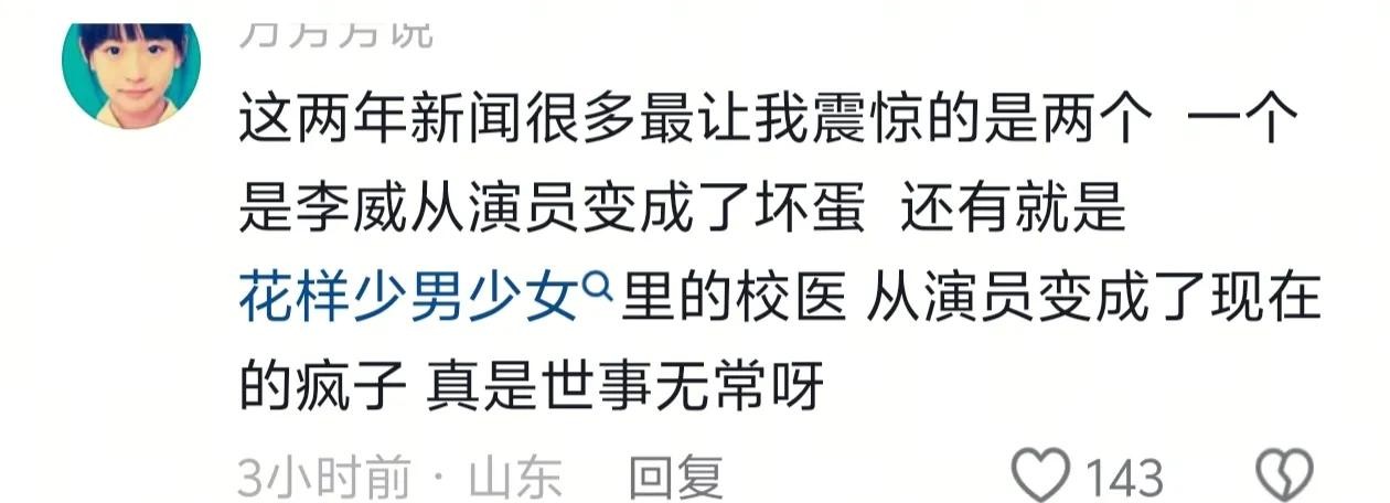此消息一出,在震惊之余不少人都为李威感到惋惜。毕竟他曾给我们的青春带来不少的好作品。2000年,李威以歌手出道。不仅发行了专辑还参演了多部比较受欢迎的影视剧,如《放羊的星星》《吐司男之吻》《斗牛,要不要》和电影《深海》等。还获得过不少的奖项。