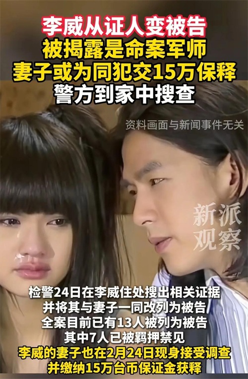 检警二十四日在李威住处搜出相关证据,并对他进行了第4次传唤。但这次他将与妻子一同列为被告,全案目前已有13人被列为被告,其中7人已被羁押禁见,李威的妻子也在二月二十四现身接受调查并缴纳15万台币保证金获释。