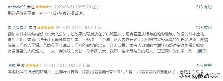 虽然《忠犬八公》的原作观众们已经看了无数次,但是对于冯小刚重新主演的《忠犬八公》,小伙伴们还是非常认可的,一致认为这是本土化最成功的翻拍片,评论区里也基本没有差评,多数都是被本片看得泪流满面。