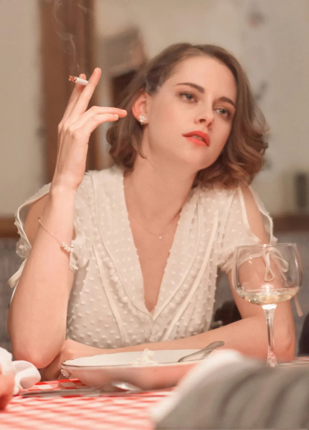 搭配一身仙女风长裙,深V领设计,裙面上镶嵌着白点,坐在略带复古风的桌前,双目无神。