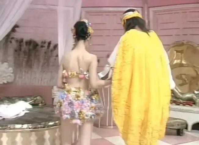 剧中女性角色的服装设计堪称"前卫"——低胸、露肩、高开衩的戏服比比皆是,苏妲己的薄纱裙装若隐若现,姜王后的礼服大胆展示肩颈线条。在物质匮乏的90年代初,这种视觉冲击不亚于一场审美革命。更有意思的是剧中毫不避讳的亲密戏码,纣王与妲己的床榻缠绵,男女演员的肢体接触尺度,放在今天都可能引发热议。