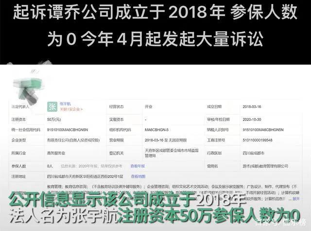 而现在告《谭谈交通》侵权的是成都的一家公司,叫成都游术文化传播有限公司,这其实是一家空壳公司,在天眼上查询这家公司的注册资本50万,成立的日期为18年(谭谈交通从05年便已经开始),参保的人数为0人,从今年四月份开始,公司出现大量诉讼,总计在98条。