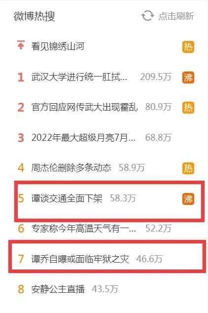 7月10日晚间,#谭谈交通全面下架#、#谭乔自曝或面临牢狱之灾#等登上新浪微博、百度热搜等各大热搜榜单。