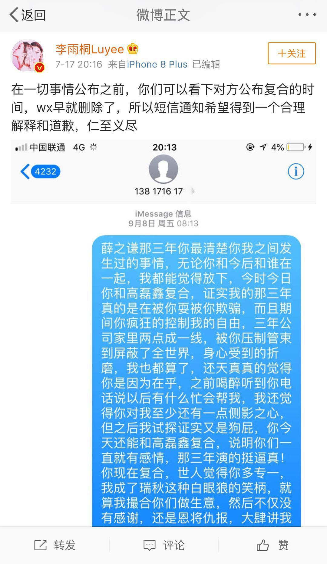 这不,7月17日,李雨桐发布的一条微博,不仅将事件再次引上热度,薛之谦的电话号码也疑似曝光了。