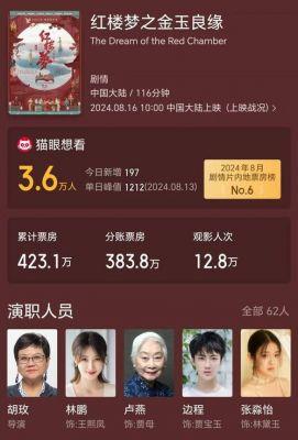 值得注意的是,尽管《红楼梦》在众多新片中的关注度较高,但实际票房表现却未能达到预期。作为一部改编自我国古典名著《红楼梦》的电影,《红楼梦》吸引了大量原著粉丝的关注。然而,从目前的首日票房来看,该片似乎并未赢得观众的青睐。