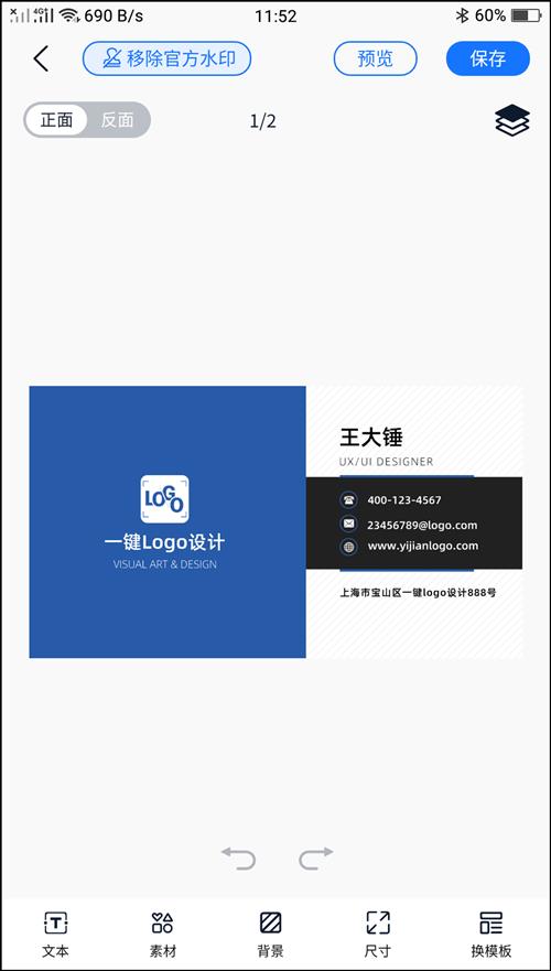 第三步:点击进入之后,我们就能看到名片也是可以操作的,我们可以替换成我们想要的背景、素材等等,还能看到名片的正面和反面,还是非常不错的,最后我们直接点击保存导出即可!