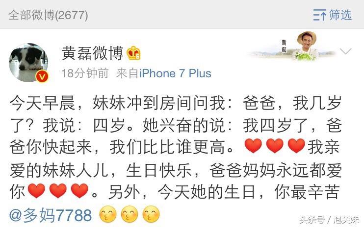 黄磊一直是模范丈夫,他和孙莉组成的家庭是娱乐圈中少有的和美典范,就在今天深夜,黄磊发微博为四岁的小女儿庆生,还向孙莉表达了浓浓的爱意,高糖虐狗。
