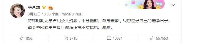 不过12日,张含韵本人却亲自在微博上澄清了:传闻不实!“特殊时期无意占用公共资源,十分抱歉。单身未婚,只想过好自己的清净日子。请某些网络用户停止编造传播不实信息。