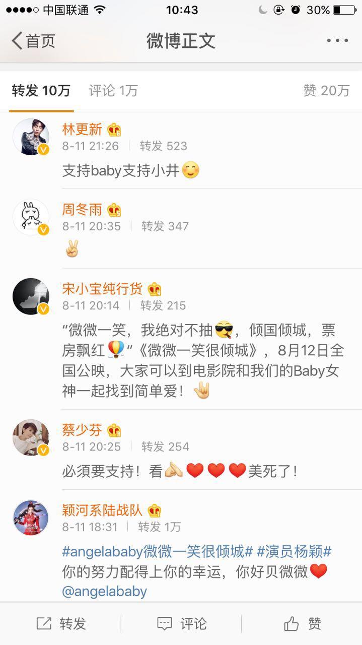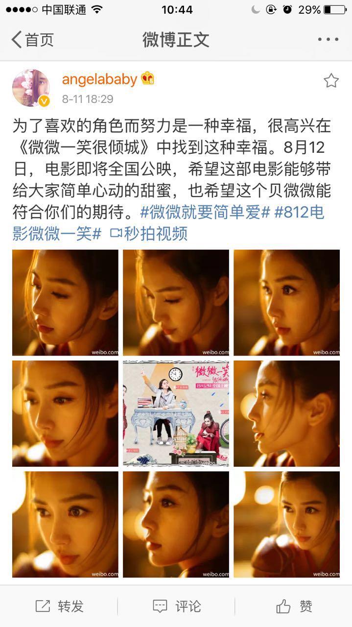 angelababy在自己的微博上发了一条宣传《微微一笑很倾城》电影上映。玩的是情怀。