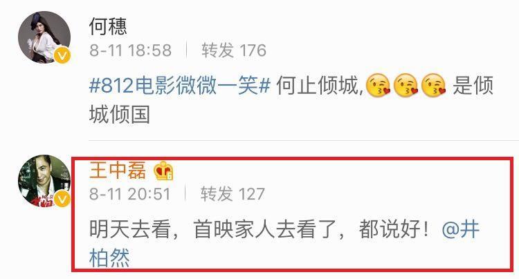 霸道总裁王中磊也转发了这条微博,并说道“首映家人都去看了,都说好”并@井柏然。