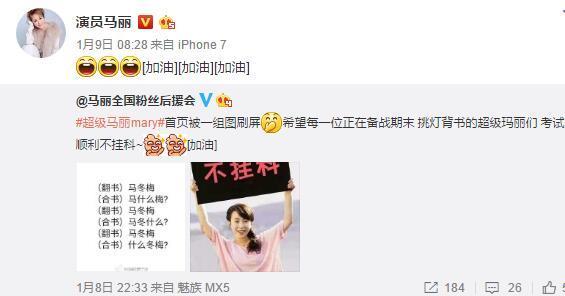 而就在前几天,迎战期末的复习党们做出一张“神图”,以“马冬梅、马什么梅、什么冬梅”来形容期末复习时合上书就忘的紧张状态,马丽也“翻牌”粉丝团,祝福大家期末考试顺利。接连上两次头条,祝福马丽爱情甜蜜!