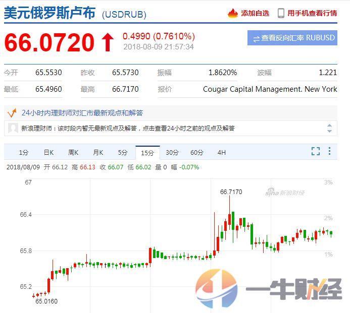 美元兑卢布汇率一度突破66卢布关口,最高触及66.7美元,为2016年11月以来的最高水平。截止发稿,北京时间8月9日22:00,美元兑卢布报价66.0720。