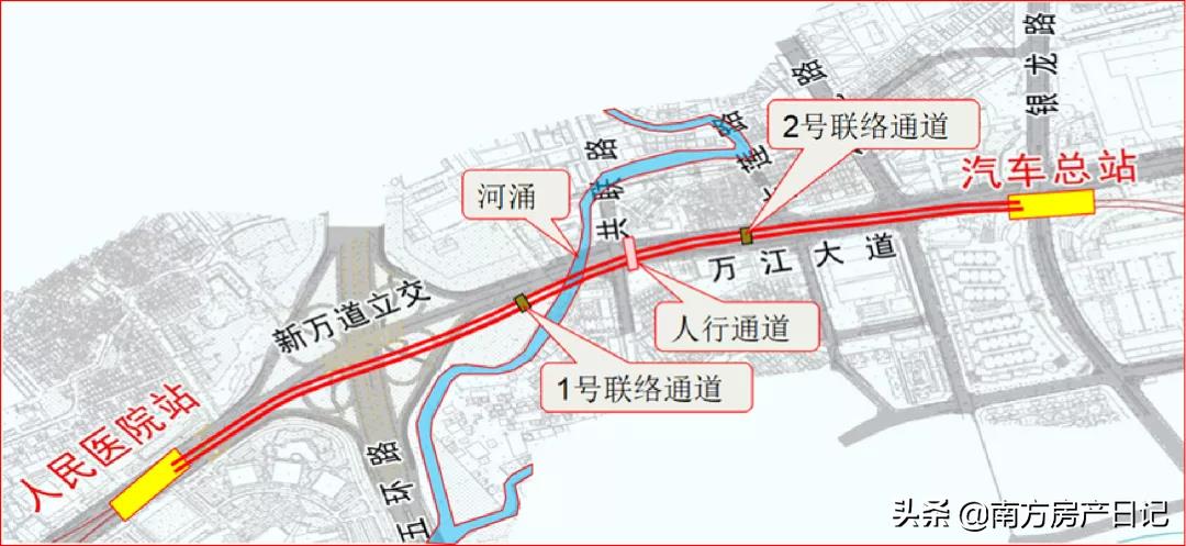 目前1号线万江段,包括道滘东站~人民医院站区间地下段(含U型槽、明挖隧道及盾构段)、人民医院站、人民医院站~汽车总站区间、汽车总站,为两站两区间,标段单线总长约2950.83米。