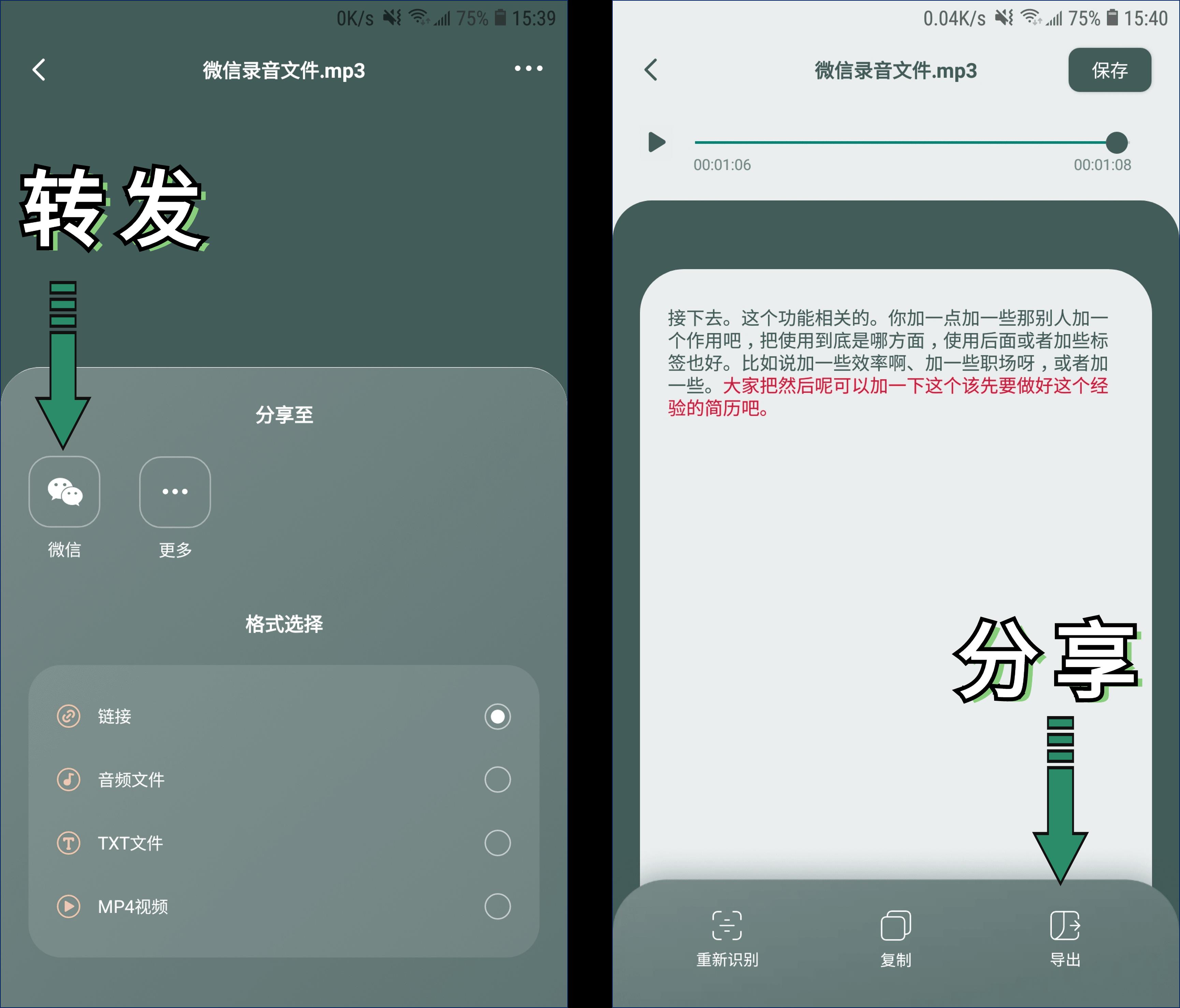 这是可以后台录音的,切换到微信窗口,播放微信语音,声音自动录入到手机中,直到结束录音。你可以直接分享音频文件给微信好友,也可以将音频转为文本。