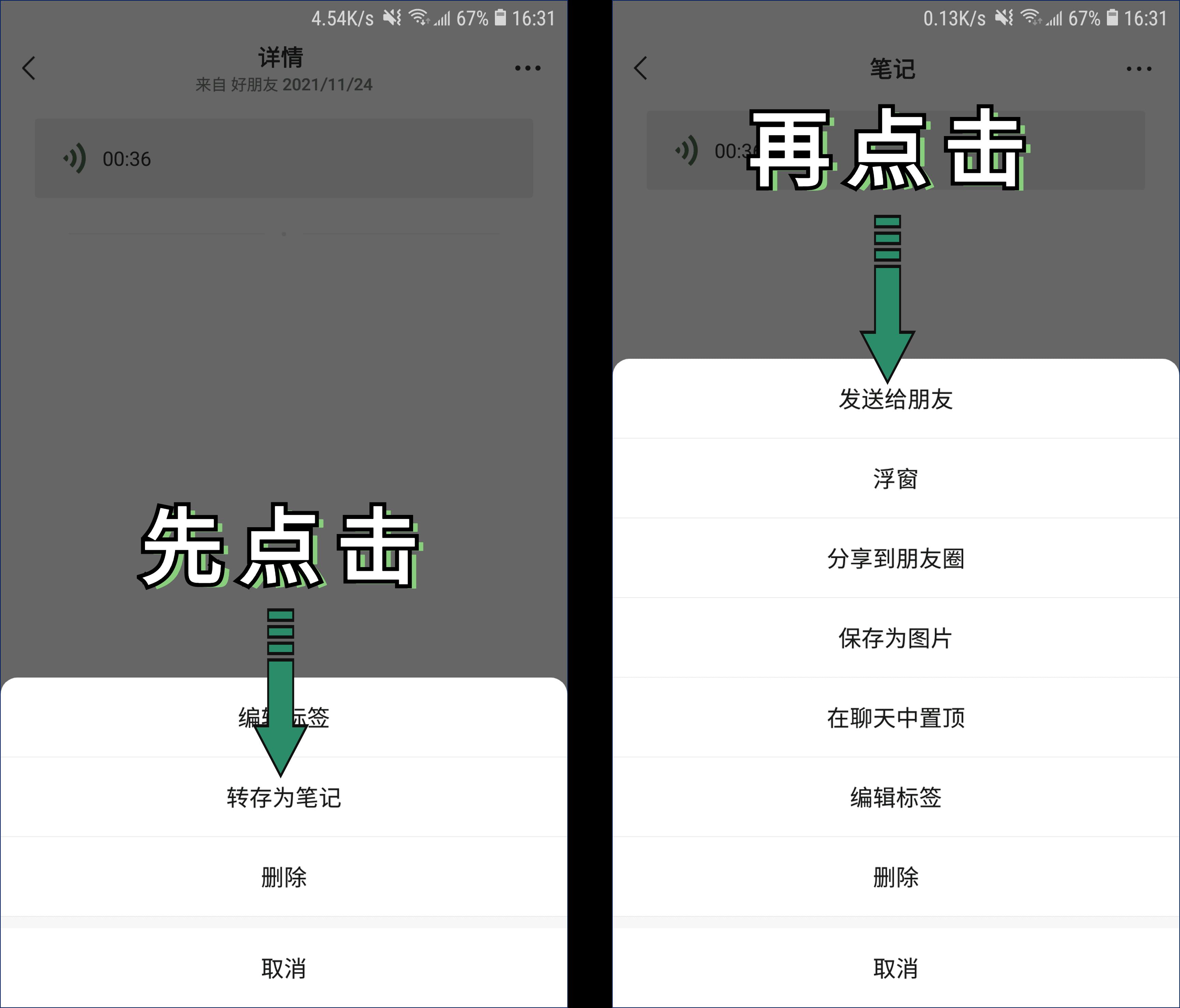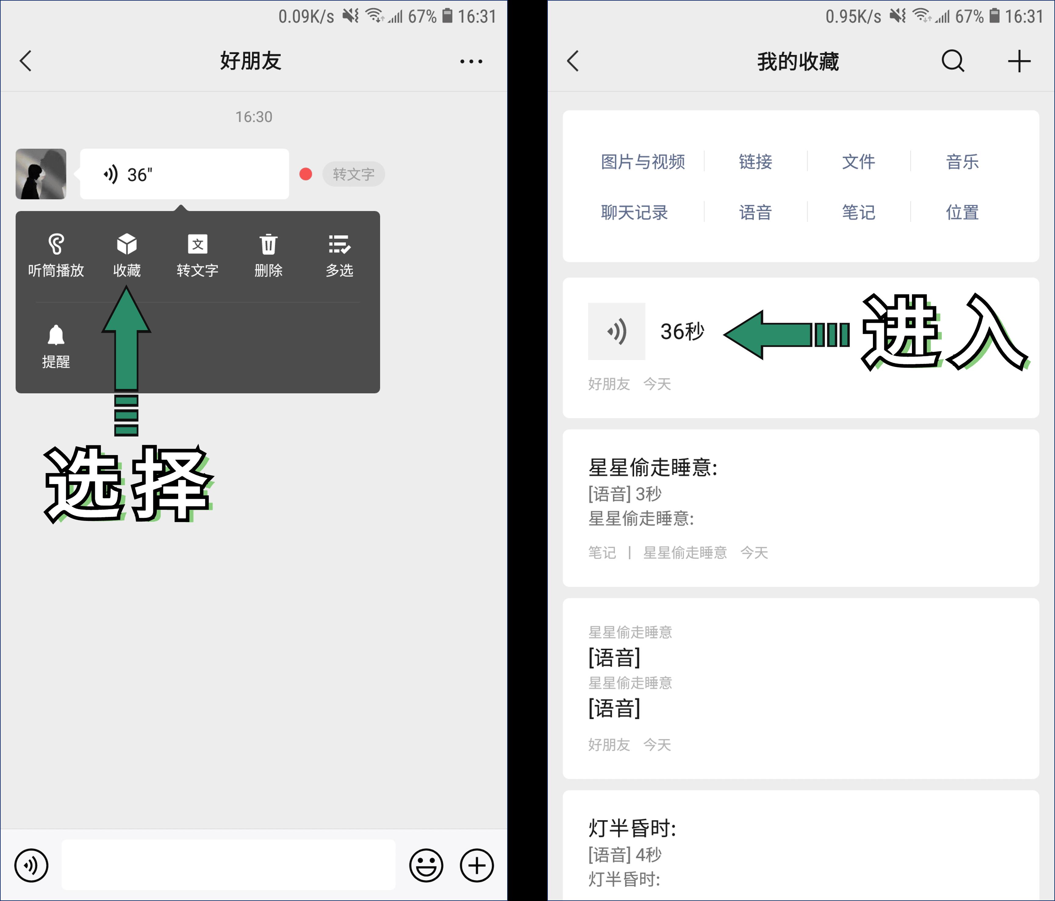 接下来进入收藏查看语音,重复上面的方法,先将语音转存为笔记,再发送给好友,这些就被合并发送了,全都是“原汁原味”的声音!