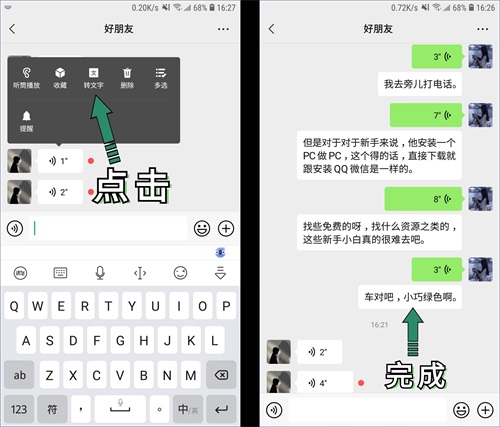 最后一种方法虽然不能直接转发语音,但可以让好友看到语音内容。就是长按微信语音,选择「转文字」功能,每段语音下方都会显示文本,再进行截图发送。