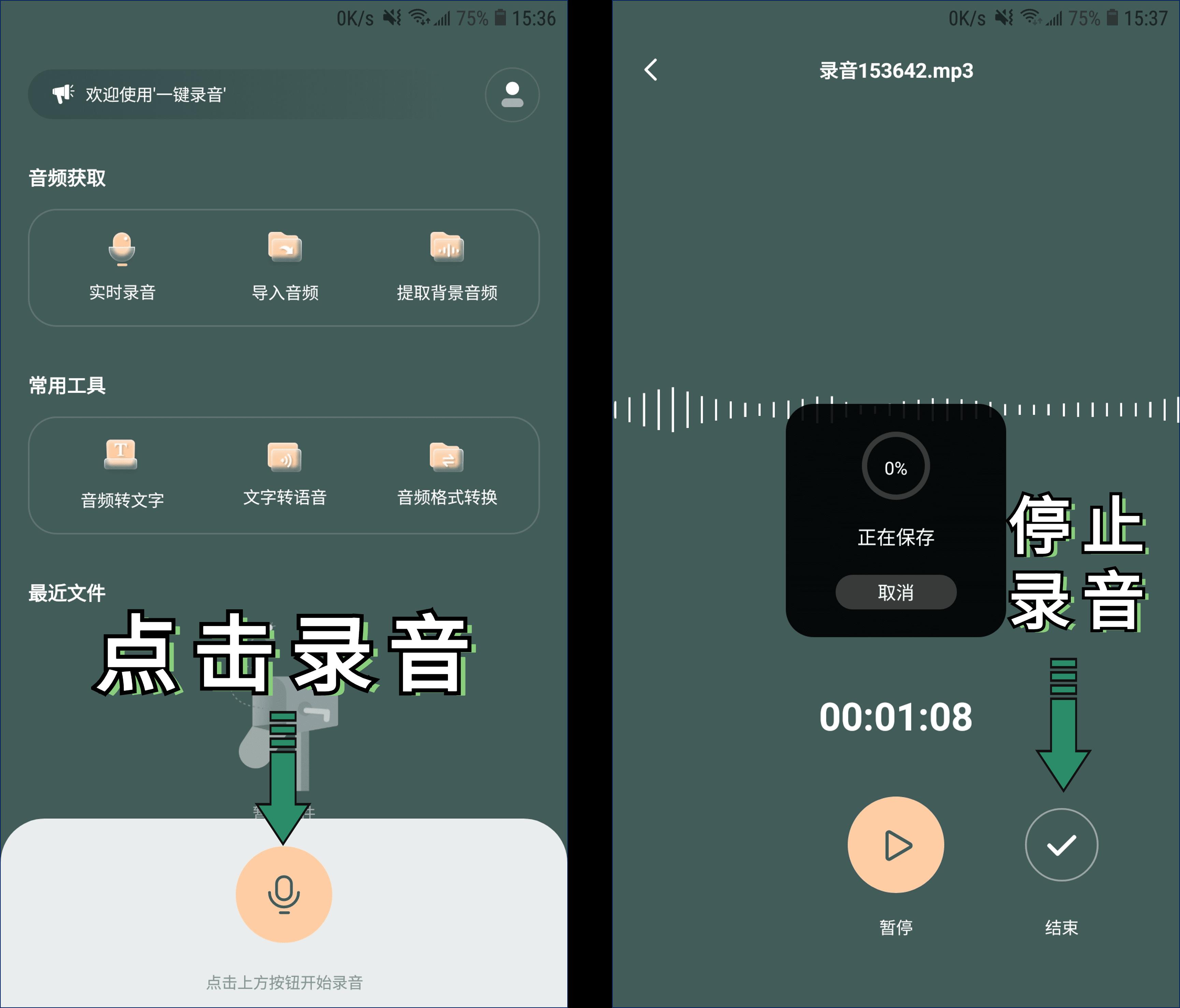 大多数手机录屏是没有声音的,我们也可以对微信语音进行录音,然后再转发录音文件给好友。打开手机上的一键录音App,点击下方麦克风按钮开始录音。
