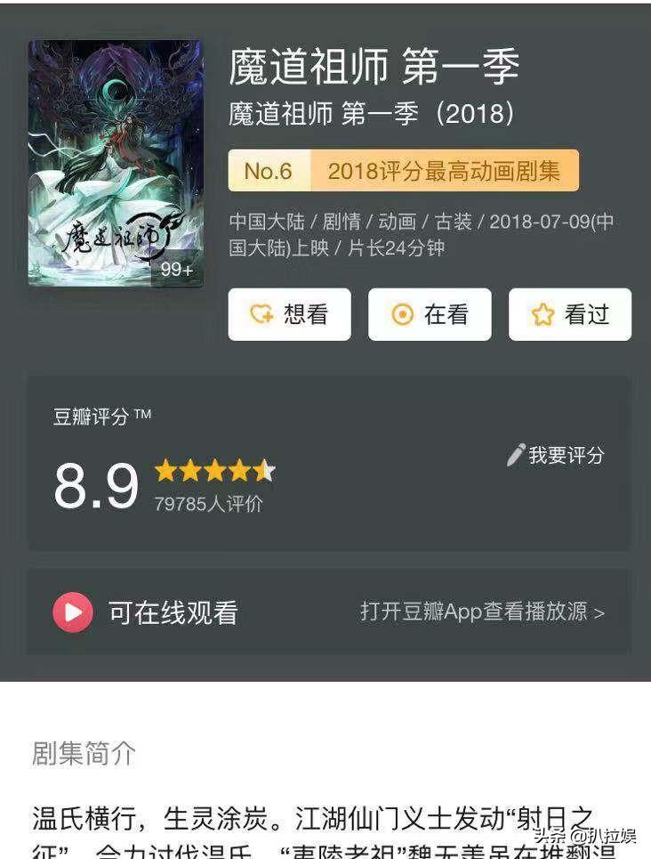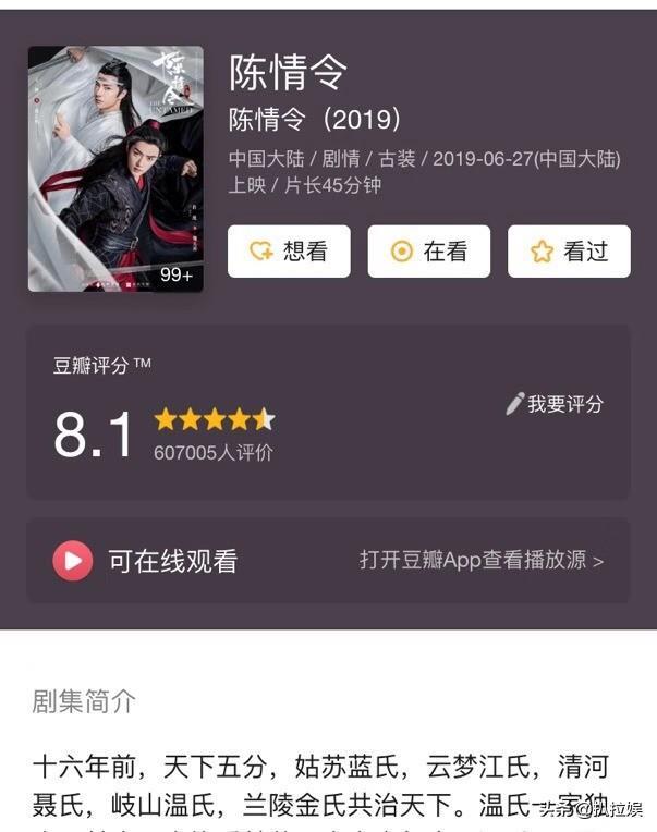 由于小说吃香,随着便有了广播剧和动漫,动漫豆瓣评分达到8.9分,在国产动漫中算是很客观的分数了!再到今年的《陈情令》,从刚开始的不被看好到各路追星女孩"真香"现场,纷纷表示今年难以逃过"博君一肖"了,豆瓣评分也是随着播放量的增加分数也蹭蹭地涨到8.1分,如此大反转,说明主演肖战的演技是可圈可点的。