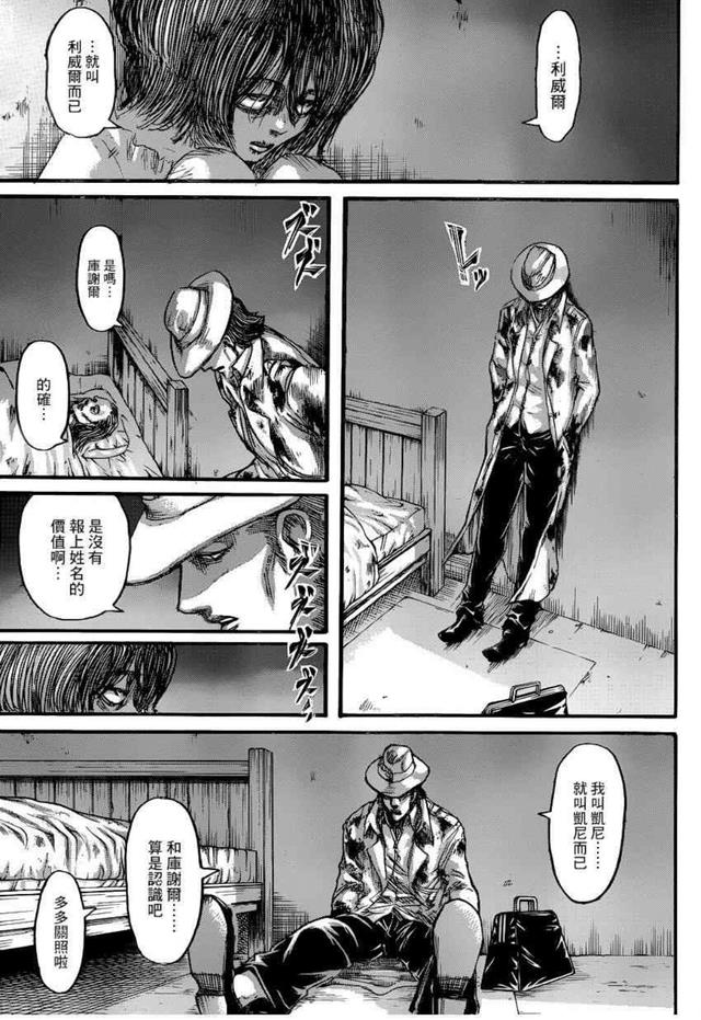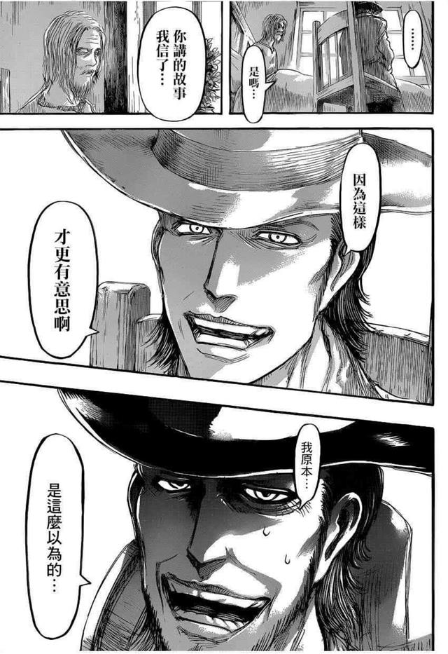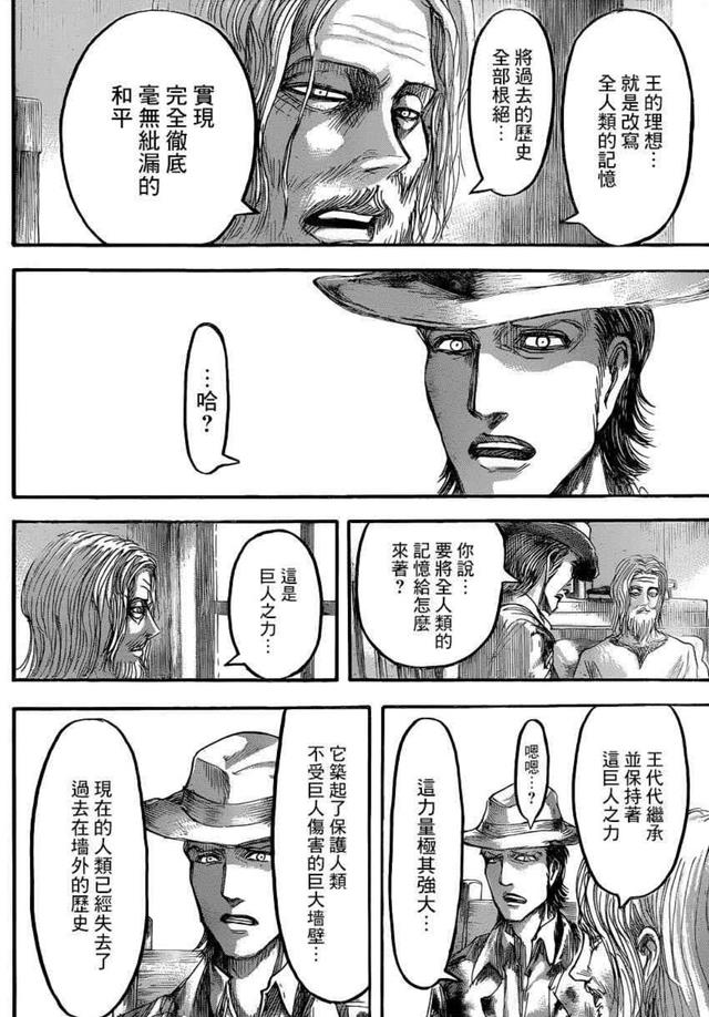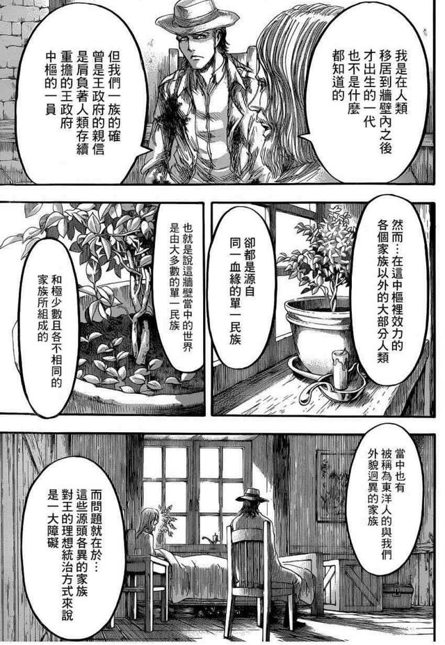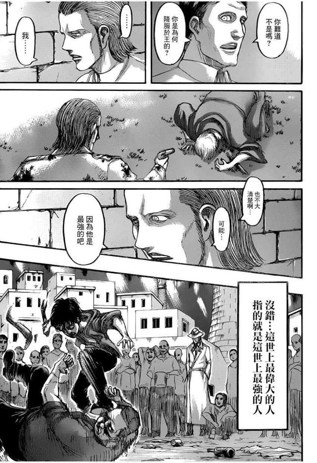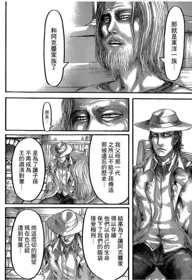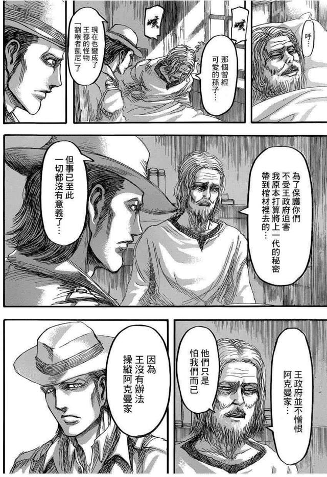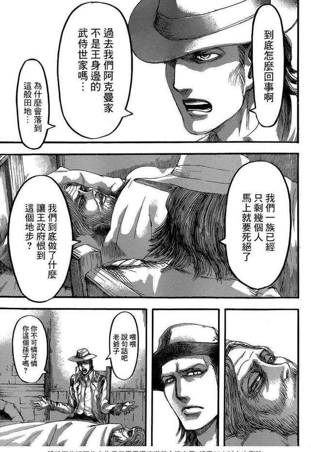 这几张图里面的对话有点多,讲的就是阿克曼家族和王室之间的恩恩怨怨,由于王由于某些事情,要去消除人类的记忆,并且根据老爷子所述,王是有这个能力的,但是仅仅局限于“大部分民族”‘其中正好不包括阿克曼家族和“东洋人”,这也是这部动漫最最开始的时候,一笔带过的对东洋人的概述。阿克曼家族原来是用来保护王室的,后来沦落到这个地步,一方面是对阿克曼家族强大的个人能力的害怕;另一方面是因为这个家族的记忆无法被篡改,就是老爷子说的“前辈用自己的生命保下了自己的脑袋去接受极刑”。而现在阿克曼家族现在只剩下寥寥几人。而现在,就是讲讲利威尔的舅舅-凯尼的故事了。