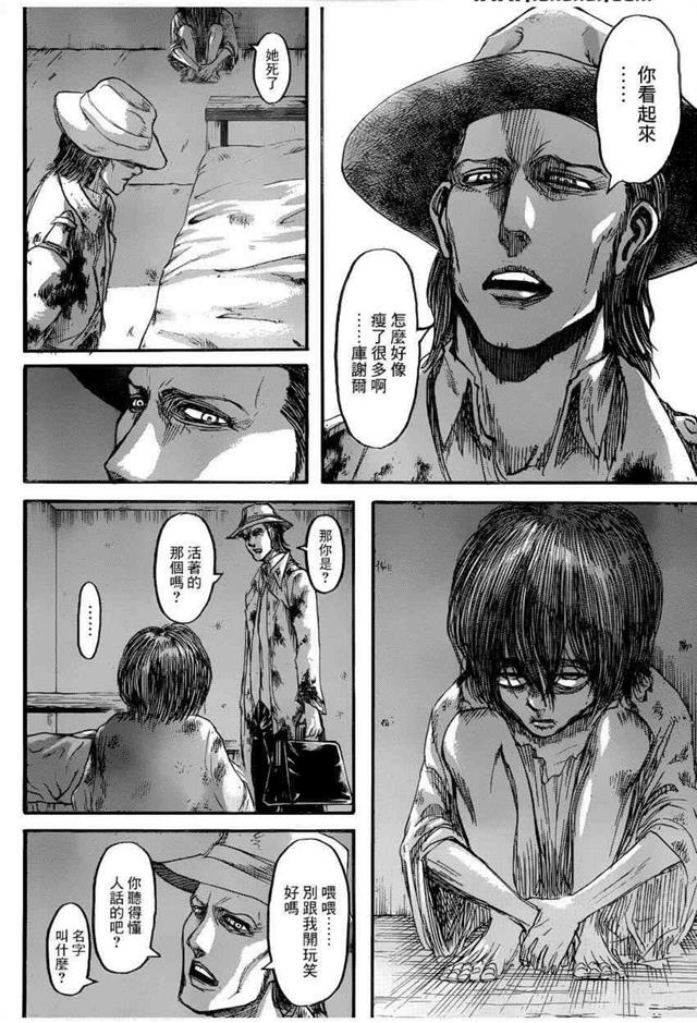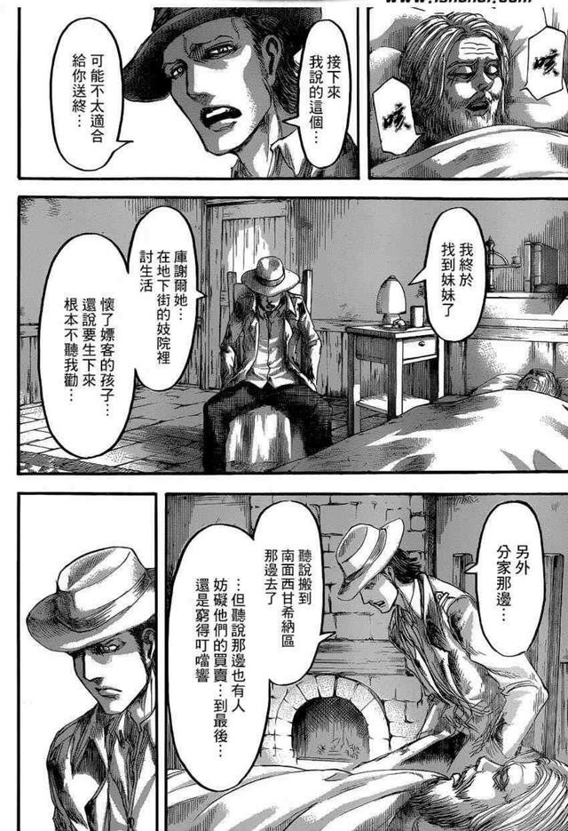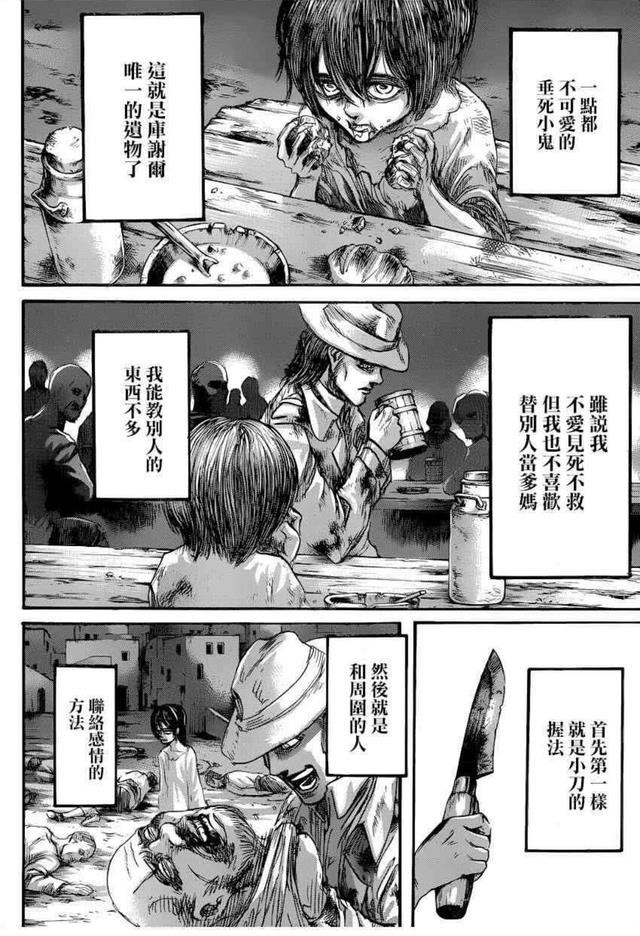这里死去的女人也就是兵长的母亲,就是开头凯尼说的"那个卖淫的妹妹,坚持将和嫖客的孩子生下来”,这其实也就是兵长的身世。