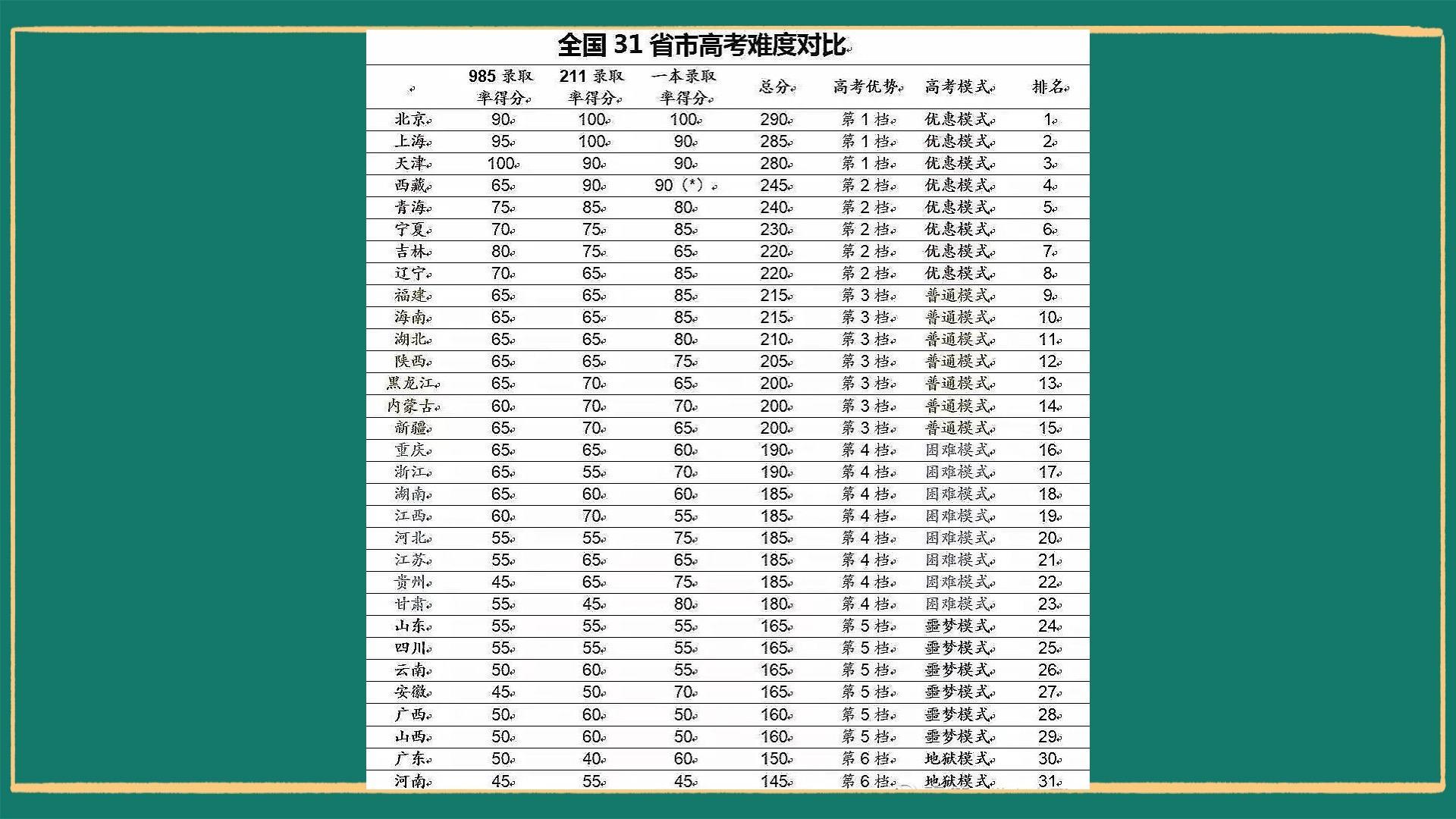你知道在哪个省份更容易考上好大学吗?知道哪些地方被称为高考最难的地域模式吗?在内蒙、新疆高考分数低的地区参加高考真的会更容易吗?几分钟的为你详细解析全国31省市的高考难易,大家好,我是让升学有更多可能的高老师,不同省份的高考难易不同,一直是一个有争议的话题。今天看一看究竟哪些省份高考是地狱模式,哪些省份高考是简单模式。为了便于您在高考期间的咨询交流,建议关注收藏。