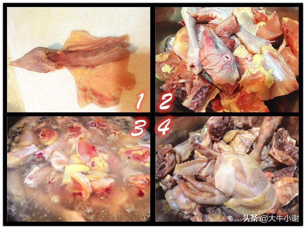(上图4)待到将水烧开后,捞出鸡肉冲洗掉鸡肉表面血沫,沥干水分;