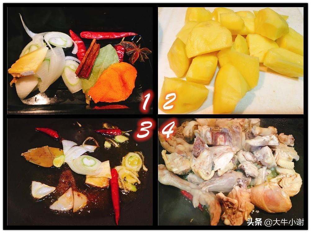 (上图1)待到鸡肉炒出油脂,将土豆块下入锅中,翻炒均匀;