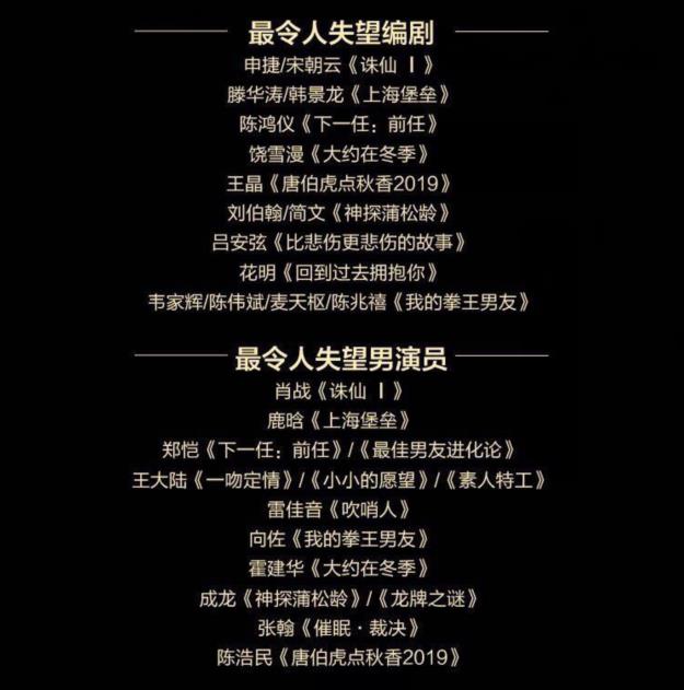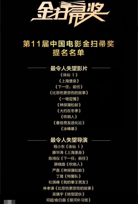 最令人失望影片入围:《诛仙》《上海堡垒》《下一任:前任》《一吻定情》《大约在冬季》《吹哨人》《神探蒲松龄》等十部影片,最令人失望导演也包括《诛仙》的程小东,滕华涛的《上海堡垒》,邓超俞白眉的《银河补习班》等等
